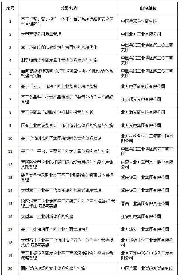 近日,中國(guó)兵器工業(yè)集團(tuán)4項(xiàng)創(chuàng)新成果獲全國(guó)企業(yè)管理現(xiàn)代化創(chuàng)新成果獎(jiǎng)、42項(xiàng)創(chuàng)新成果獲國(guó)防科技工業(yè)企業(yè)管理創(chuàng)新成果獎(jiǎng)。 全國(guó)企業(yè)管理現(xiàn)代化創(chuàng)新成果 經(jīng)全國(guó)企業(yè)管理現(xiàn)代化創(chuàng)新成果審定委員會(huì)終審,第二十五屆全國(guó)企業(yè)管理現(xiàn)代化創(chuàng)新成果公布,中國(guó)兵器工業(yè)集團(tuán)4項(xiàng)創(chuàng)新成果榮獲二等獎(jiǎng)。 二等獎(jiǎng) 國(guó)防科技工業(yè)企業(yè)管理創(chuàng)新成果 2018年度國(guó)防科技工業(yè)企業(yè)管理創(chuàng)新獲獎(jiǎng)成果名單發(fā)布,中國(guó)兵器工業(yè)集團(tuán)共獲獎(jiǎng)42項(xiàng),其中:一等獎(jiǎng)7項(xiàng),二等獎(jiǎng)15項(xiàng),三等獎(jiǎng)20項(xiàng)。獲獎(jiǎng)總量及一等獎(jiǎng)數(shù)量均位于軍工集團(tuán)首位。 一等獎(jiǎng) 二等獎(jiǎng) 三等獎(jiǎng) 據(jù)悉,2018年度的國(guó)防科技工業(yè)企業(yè)管理創(chuàng)新評(píng)審工作,經(jīng)專家初審、函審、一等獎(jiǎng)候選成果答辯、專家會(huì)議評(píng)審、評(píng)審委員會(huì)審核并公示后,評(píng)選出一批在履行強(qiáng)軍首責(zé)、全面貫徹創(chuàng)新驅(qū)動(dòng)發(fā)展戰(zhàn)略和全面深化改革、高質(zhì)量發(fā)展等方面的優(yōu)秀成果。本年度共確定獲獎(jiǎng)成果307項(xiàng),其中一等獎(jiǎng)44項(xiàng),二等獎(jiǎng)126項(xiàng),三等獎(jiǎng)137項(xiàng)。 |