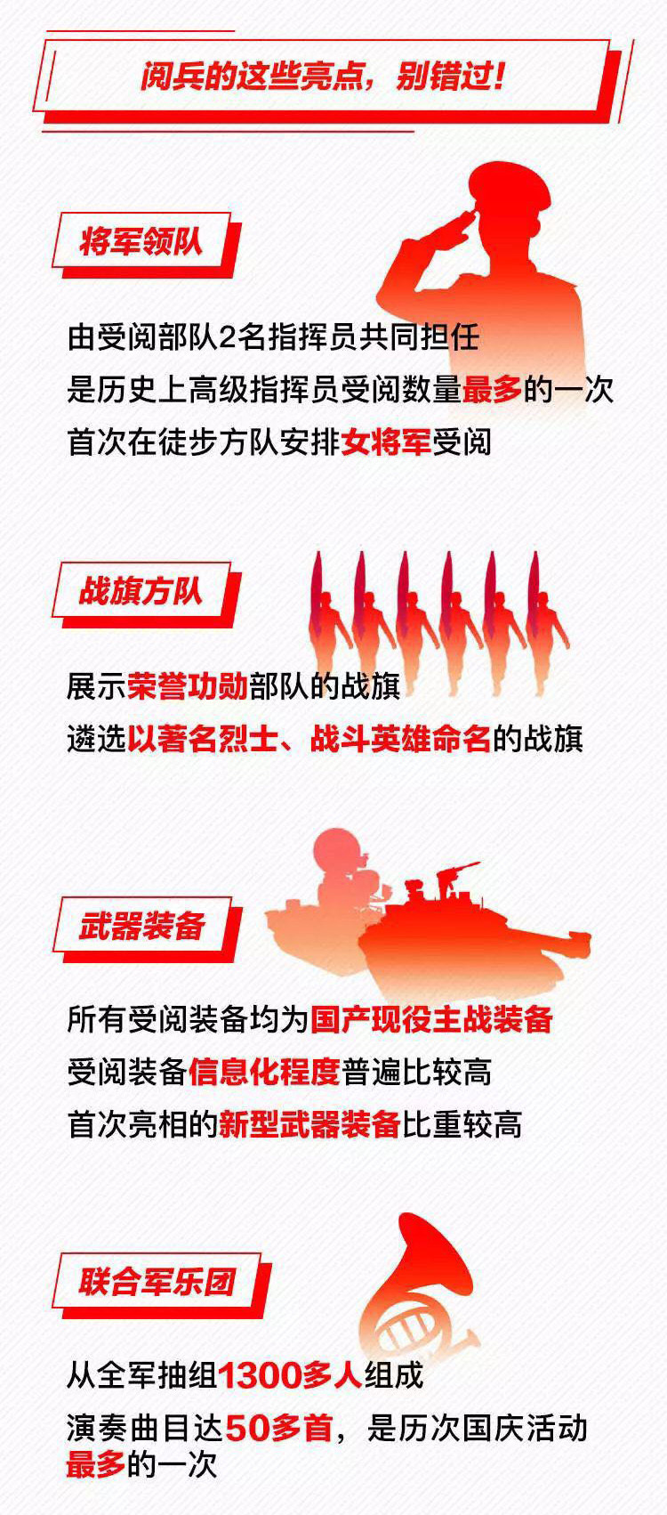 為慶祝新中國成立70周年,10月1日北京天安門廣場將舉行盛大閱兵式。屆時,32個裝備方隊、12個空中梯隊將通過天安門廣場,接受檢閱。此次閱兵,所有受閱裝備均為國產(chǎn)現(xiàn)役主戰(zhàn)裝備,其中包括我軍部分新型裝備,是近幾次閱兵中規(guī)模最大的一次。 強(qiáng)國必須強(qiáng)軍,強(qiáng)軍必須利器。作為我軍機(jī)械化、信息化、智能化裝備發(fā)展的骨干,全軍毀傷打擊的核心支撐和現(xiàn)代化新型陸軍體系作戰(zhàn)能力科研制造的主體,此次國慶閱兵式,兵器工業(yè)集團(tuán)研制生產(chǎn)的16型裝備將接受黨和人民的檢閱,分布在受閱裝備方隊7個模塊中的陸上作戰(zhàn)、防空反導(dǎo)、信息作戰(zhàn)、無人作戰(zhàn)、后裝保障五個模塊、32個方隊中的12個方隊,集中展示了兵器工業(yè)集團(tuán)履行強(qiáng)軍首責(zé)、自主創(chuàng)新的最新成果。 10月1日大閱兵 我們準(zhǔn)備好了 |