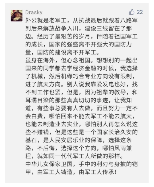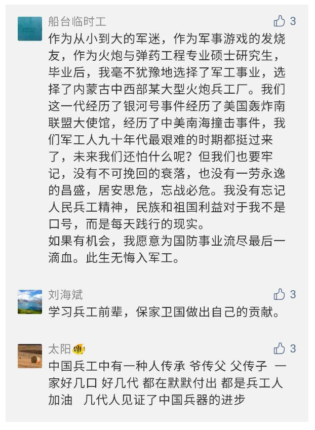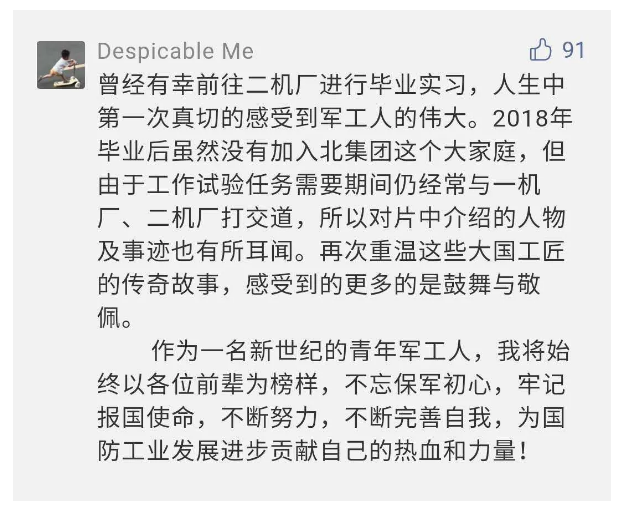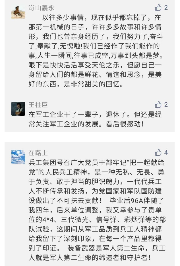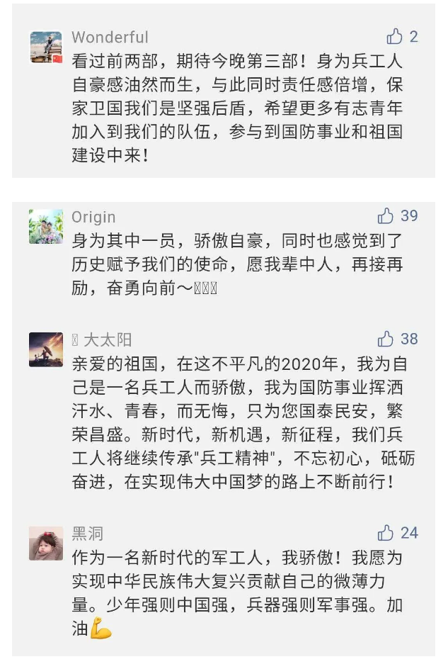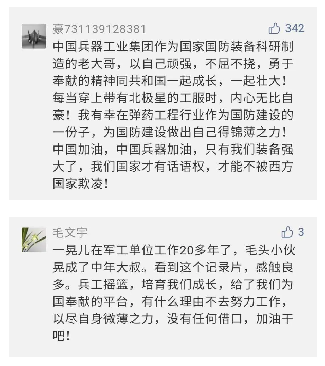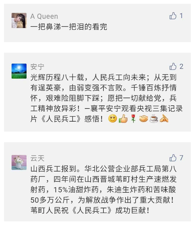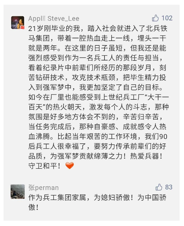 在中國共產(chǎn)黨成立九十九周年之際,由中國兵器工業(yè)集團有限公司組織攝制、反映人民兵工在黨的領(lǐng)導下80余年光輝奮斗歷程、廣大兵工人弘揚“把一切獻給黨”人民兵工精神的三集紀錄片《人民兵工》自7月1日-3日每晚20點在中央廣播電視總臺中文國際頻道(CCTV-4)《國家記憶》首播以來,在兵器系統(tǒng)和觀眾中引發(fā)強烈反響,很多網(wǎng)友、觀眾紛紛留言表達了自己的觀后感受。 觀眾在兵器工業(yè)集團官微的留言區(qū)直抒了觀影感受,有的熱淚盈眶,有的心潮起伏,有的興起賦詩,有的認為讓心靈得到凈化、思想得以提升,有的認為是最直觀的國防教育教材...... 影片勾起了退休老同志無限懷念、兵工人的甜美記憶、攝制期間官田中央兵工廠文化教育基地工作人員的難忘瞬間...... 相比老一輩,年a輕的兵工人也表達了傳承紅色基因,弘揚新時代“把一切獻給黨”的人民兵工精神的豪邁氣概...... 其中也不乏在校的學生,在感謝英模樹立的榜樣和豐碑的同時,也為自己的職業(yè)生涯定好坐標、做好規(guī)劃,努力前行...... 作為新時代弘揚人民兵工精神的特色文化成果,紀錄片的播出,凝聚起廣大兵器干部職工團結(jié)奮斗新時代磅礴力量,極大的增強了兵工人的自豪感,大家紛紛表達了作為軍工央企一員 “此生無悔入軍工”的使命擔當...... 《人民兵工》共分為三集,分別是《搖籃》《錘煉》《前行》,全景式展示了我們黨領(lǐng)導和創(chuàng)建的第一個軍事工業(yè)部門——人民兵工80余年來從無到有、從小到大、從弱到強的光輝奮斗歷程,生動講述了廣大兵工人聽黨話、跟黨走,大力弘揚“把一切獻給黨”的人民兵工精神,自力更生、艱苦奮斗、開拓進取、無私奉獻的家國情懷和感人事跡。在人民兵工80余年篳路藍縷的奮斗歷程中,涌現(xiàn)出吳運鐸、倪志福、祝榆生等一大批英模人物,在血與火的考驗中凝練形成了“把一切獻給黨”的人民兵工精神,成為人民兵工奮斗不息的紅色基因。(王珊) |