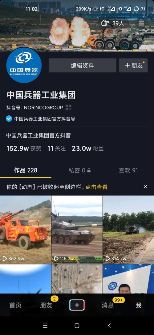 近日 中國(guó)兵器工業(yè)集團(tuán)抖音號(hào) 喜獲殊榮 成為2020年政務(wù)抖音號(hào) 優(yōu)秀創(chuàng)作者 2020年1月 集團(tuán)公司抖音號(hào)正式開通 近1年來,短視頻宣傳取得良好效果 截至目前,共發(fā)布視頻228個(gè) 總粉絲數(shù)23萬,獲贊152萬 播放總量已超8000萬 |