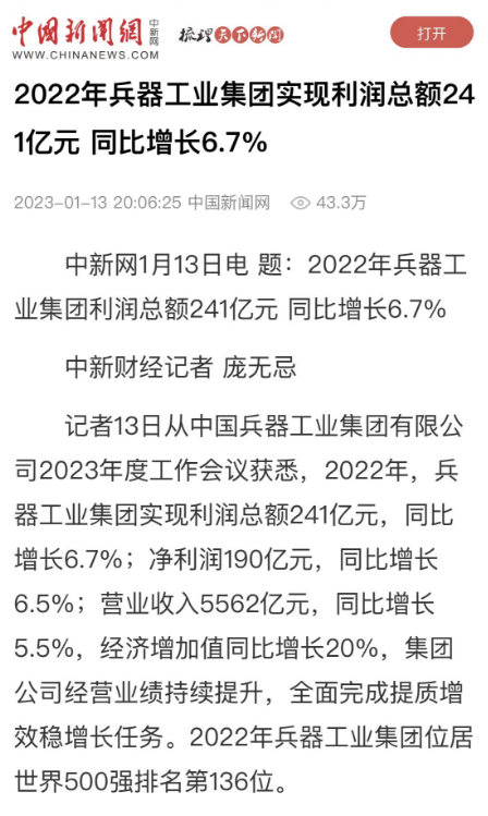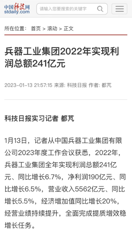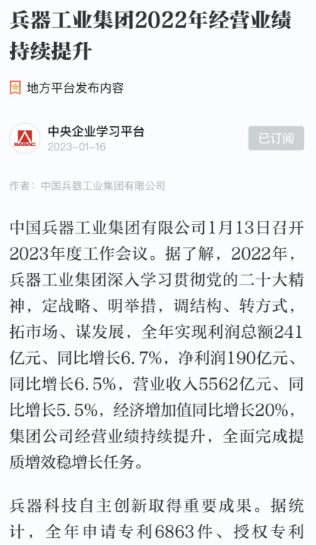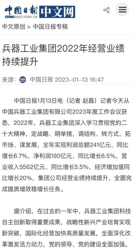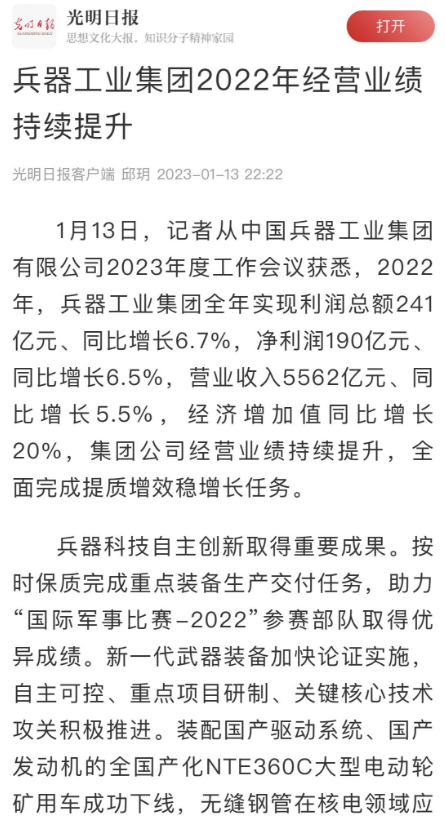 1月13日,中國兵器工業(yè)集團有限公司召開2023年度工作會議,傳達學習中央領導同志、軍方首長和上級部門重要批示,總結集團公司2022年工作,研究部署2023年主要工作任務。 集團公司2022年重點工作取得的成績及下一步的改革發(fā)展受到社會媒體廣泛關注。新華社、新華財經、人民網、經濟日報客戶端、光明日報客戶端、中國日報網、中國科技網、中國新聞網、央廣網、國資委網站、學習強國中央企業(yè)學習平臺、新浪網、騰訊網、搜狐網、網易網、今日頭條等中央主流媒體、國家部委網站及知名網絡媒體對集團公司工作會議進行了報道,重點關注集團公司高質量發(fā)展、科技創(chuàng)新、戰(zhàn)略性新興產業(yè)培育、深化改革、國際化經營、履行央企社會責任等內容。其中新華社以《北斗時空智能服務平臺累計服務終端數突破15億》為題,重點報道了集團公司2022年在自主創(chuàng)新、戰(zhàn)略新興產業(yè)培育、專利申請等方面取得的成績;經濟日報客戶端、光明日報客戶端、中國日報網等以《兵器工業(yè)集團2022年經營業(yè)績持續(xù)提升》為題,重點報道了集團公司在高質量發(fā)展、全面完成提質增效穩(wěn)增長方面取得的成績。集團公司門戶網站、微信公眾號、微博等新媒體也對集團公司工作會議進行了及時報道,各成員單位紛紛對相關內容進行轉載,引發(fā)全系統(tǒng)關注。 新華社:北斗時空智能服務平臺累計服務終端數突破15億 新華財經:兵器工業(yè)集團2022年實現凈利潤190億元 同比增長6.5% 人民網:2022年中央企業(yè)營收同比增長8.3% 科技創(chuàng)新成效顯著 經濟日報客戶端:兵器工業(yè)集團2022年經營業(yè)績持續(xù)提升 光明日報客戶端:兵器工業(yè)集團2022年經營業(yè)績持續(xù)提升 中國日報網:兵器工業(yè)集團2022年經營業(yè)績持續(xù)提升 中國科技網:兵器工業(yè)集團2022年實現利潤總額241億元 中國新聞網:2022年兵器工業(yè)集團實現利潤總額241億元 同比增長6.7% 國資委網站:2022年兵器工業(yè)集團實現利潤總額241億元 同比增長6.7% 學習強國中央企業(yè)學習平臺:兵器工業(yè)集團2022年經營業(yè)績持續(xù)提升 集團公司職工及廣大網友熱議工作會議 “這次會議全面總結了2022年工作,深入分析研判當前形勢,部署2023年重點工作,為我們做好2023年及今后一個時期的工作明確了目標、堅定了信心?!?/p> “作為兵工人,我要苦練內功、不懼挑戰(zhàn)、奮勇向前,為建設具有全球競爭力的世界一流集團公司貢獻自己的力量?!?/p> “聚焦高科技領域,制造更多的大國重器,讓更多的產品服務老百姓?!?/p> “在不平凡的2022年取得了亮眼的工作成績,為兵器工業(yè)點贊?!?/p> “希望能有更多新型武器裝備部隊,2023年,望你們再創(chuàng)輝煌,加油!” |