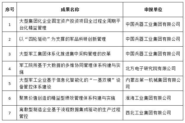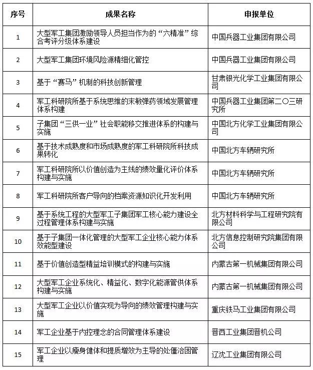 近日,中國(guó)兵器工業(yè)集團(tuán)4項(xiàng)創(chuàng)新成果獲全國(guó)企業(yè)管理現(xiàn)代化創(chuàng)新成果獎(jiǎng)、42項(xiàng)創(chuàng)新成果獲國(guó)防科技工業(yè)企業(yè)管理創(chuàng)新成果獎(jiǎng)。 全國(guó)企業(yè)管理現(xiàn)代化創(chuàng)新成果 經(jīng)全國(guó)企業(yè)管理現(xiàn)代化創(chuàng)新成果審定委員會(huì)終審,第二十五屆全國(guó)企業(yè)管理現(xiàn)代化創(chuàng)新成果公布,中國(guó)兵器工業(yè)集團(tuán)4項(xiàng)創(chuàng)新成果榮獲二等獎(jiǎng)。 二等獎(jiǎng) 國(guó)防科技工業(yè)企業(yè)管理創(chuàng)新成果 2018年度國(guó)防科技工業(yè)企業(yè)管理創(chuàng)新獲獎(jiǎng)成果名單發(fā)布,中國(guó)兵器工業(yè)集團(tuán)共獲獎(jiǎng)42項(xiàng),其中:一等獎(jiǎng)7項(xiàng),二等獎(jiǎng)15項(xiàng),三等獎(jiǎng)20項(xiàng)。獲獎(jiǎng)總量及一等獎(jiǎng)數(shù)量均位于軍工集團(tuán)首位。 一等獎(jiǎng) 二等獎(jiǎng) 三等獎(jiǎng) 據(jù)悉,2018年度的國(guó)防科技工業(yè)企業(yè)管理創(chuàng)新評(píng)審工作,經(jīng)專家初審、函審、一等獎(jiǎng)候選成果答辯、專家會(huì)議評(píng)審、評(píng)審委員會(huì)審核并公示后,評(píng)選出一批在履行強(qiáng)軍首責(zé)、全面貫徹創(chuàng)新驅(qū)動(dòng)發(fā)展戰(zhàn)略和全面深化改革、高質(zhì)量發(fā)展等方面的優(yōu)秀成果。本年度共確定獲獎(jiǎng)成果307項(xiàng),其中一等獎(jiǎng)44項(xiàng),二等獎(jiǎng)126項(xiàng),三等獎(jiǎng)137項(xiàng)。 |